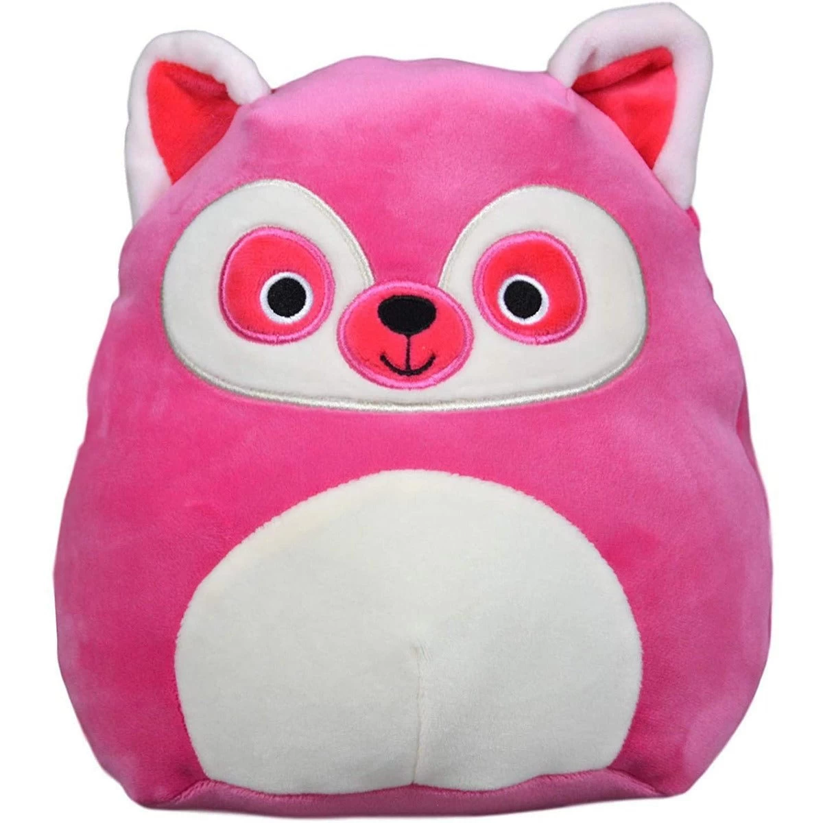 Lucia is a hot pink lemur whose triangular ears, belly and mask markings are white. The insides of her ears, markings around her eyes and her muzzle are all red. She has black eyes ringed in white, as well as a black nose and mouth.